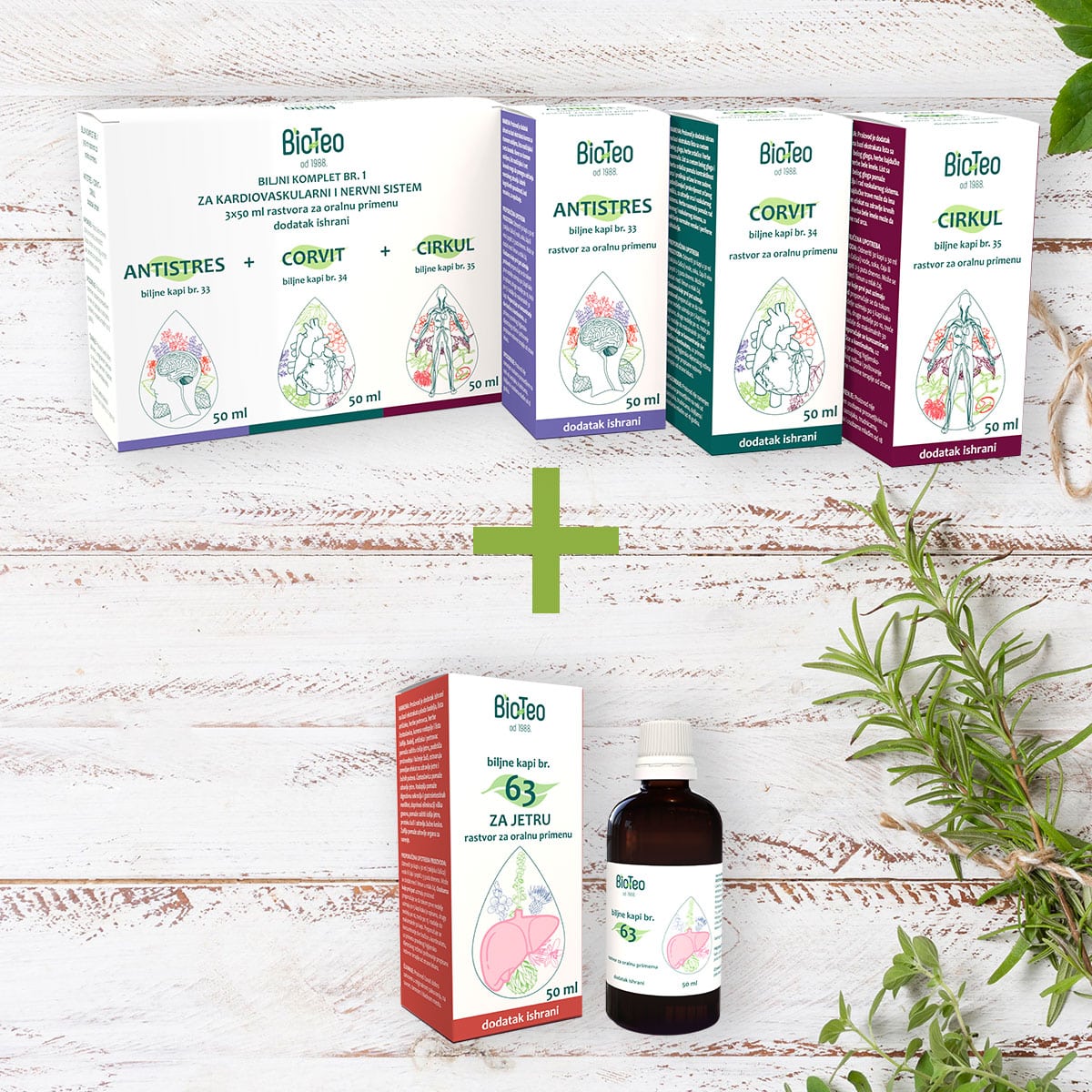 Specijalna ponuda: Biljni komplet br. 1 za kardiovaskularni i nervni sistem + Biljne kapi br. 63 za jetru – 4x50ml